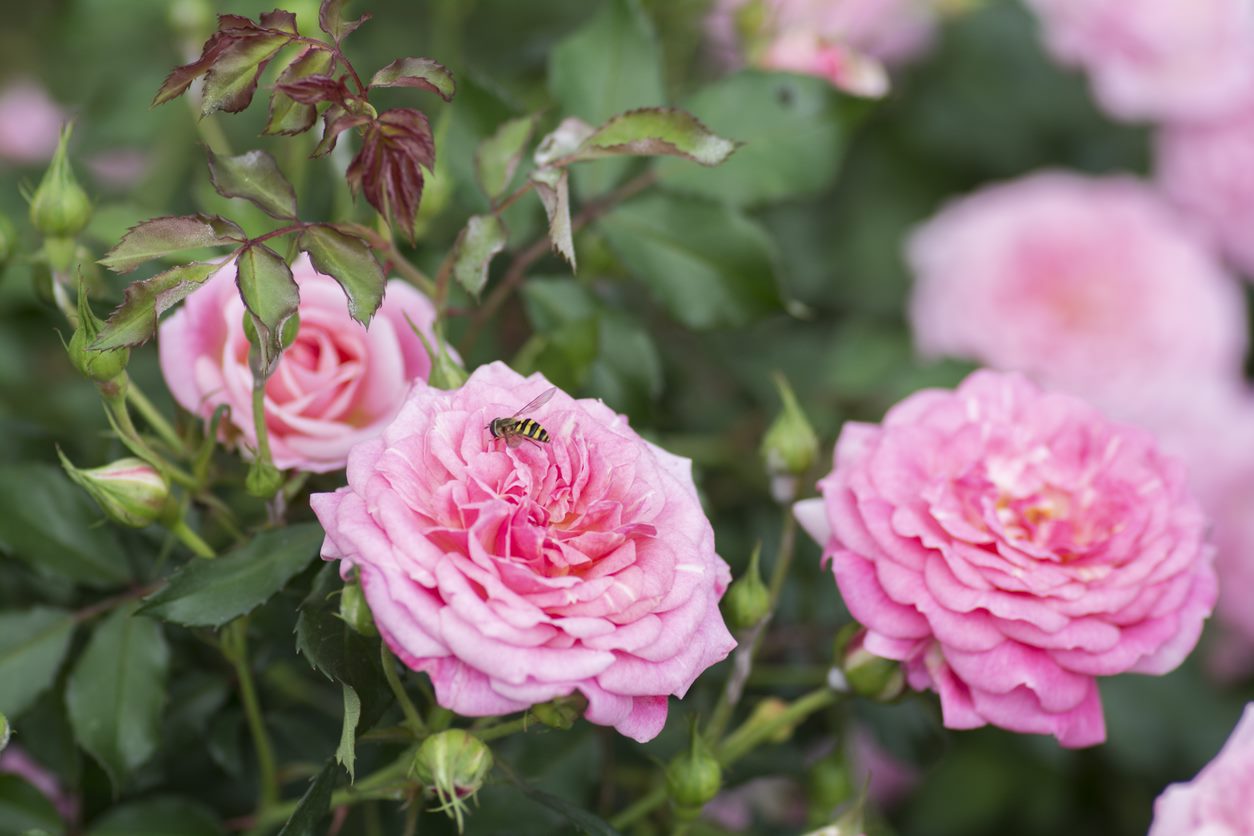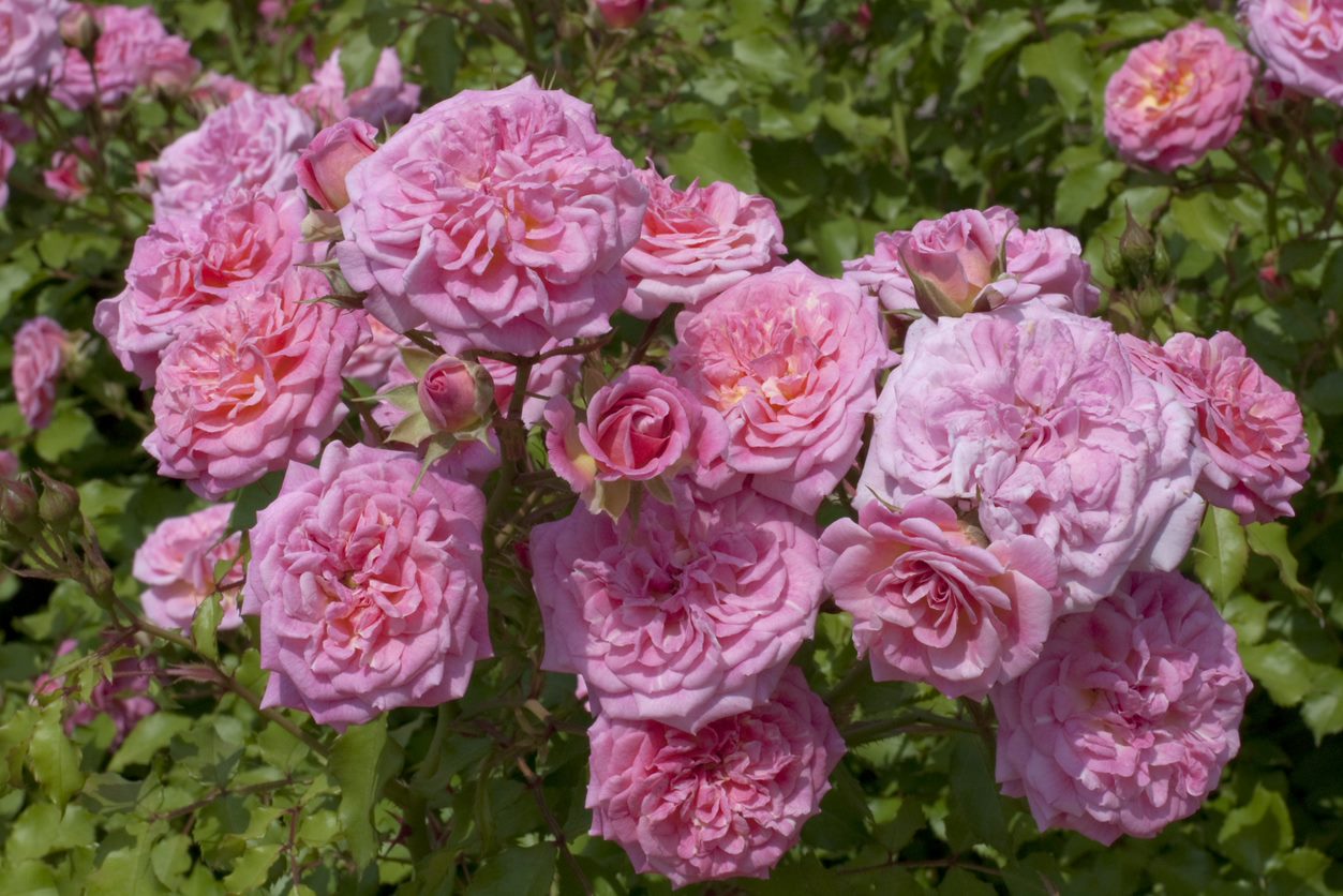 - Compact, spreading Rose. Green, Glossy foliage provides nice contrast to its clear-pink, double flowers. Blooms late spring through early fall