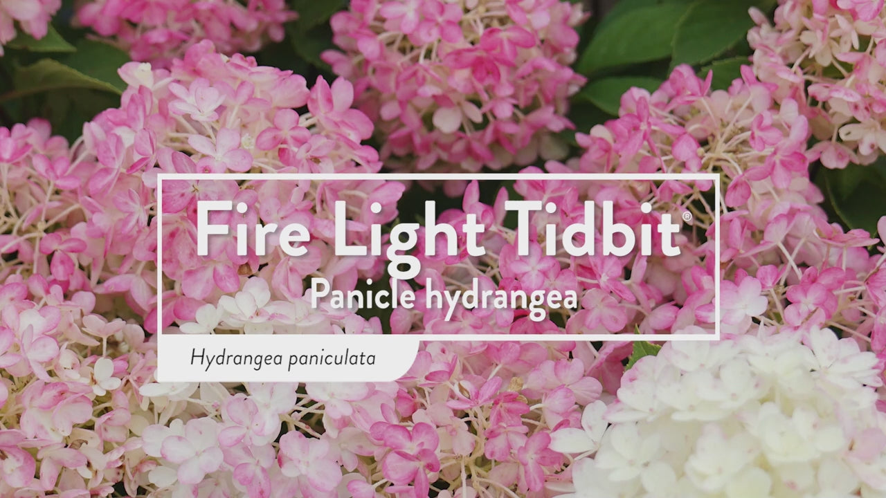 Details: A live outdoor plant from Green Promise Farms. Fire Light Tidbit hydrangea blooms in mid-summer. The flowers start white and develop their pink coloration beginning in late August when the weather gets cooler. Don't sacrifice your flower coverage - blooms cover the compact form from top to bottom. Its long bloom period means you'll enjoy colorful flowers for 3+ months every year. Fire Light Tidbit™ hydrangea's unique small size makes it is easy to tuck into perennial borders. It also does well in containers. Homeowner Growing and Maintenance Tips: Plant in full or part sun in cooler climates. In warm areas, plant with some morning sun and shade during the hottest part of the day. Any well-drained soil will do - as long as the soil doesn't stay wet for long periods, Fire Light Tidbit hydrangea will grow happily. Easy-care panicle hydrangeas don't need much fertilizer - one application of a granular rose fertilizer in early spring is sufficient. Pruning panicle hydrangeas like Fire Light Tidbit is easy: just cut each stem back by about one-third its total height in late winter or early spring, and remove any thin, spindly branches. This builds a strong base while encouraging lots of new growth for dozens of fabulous flowers.