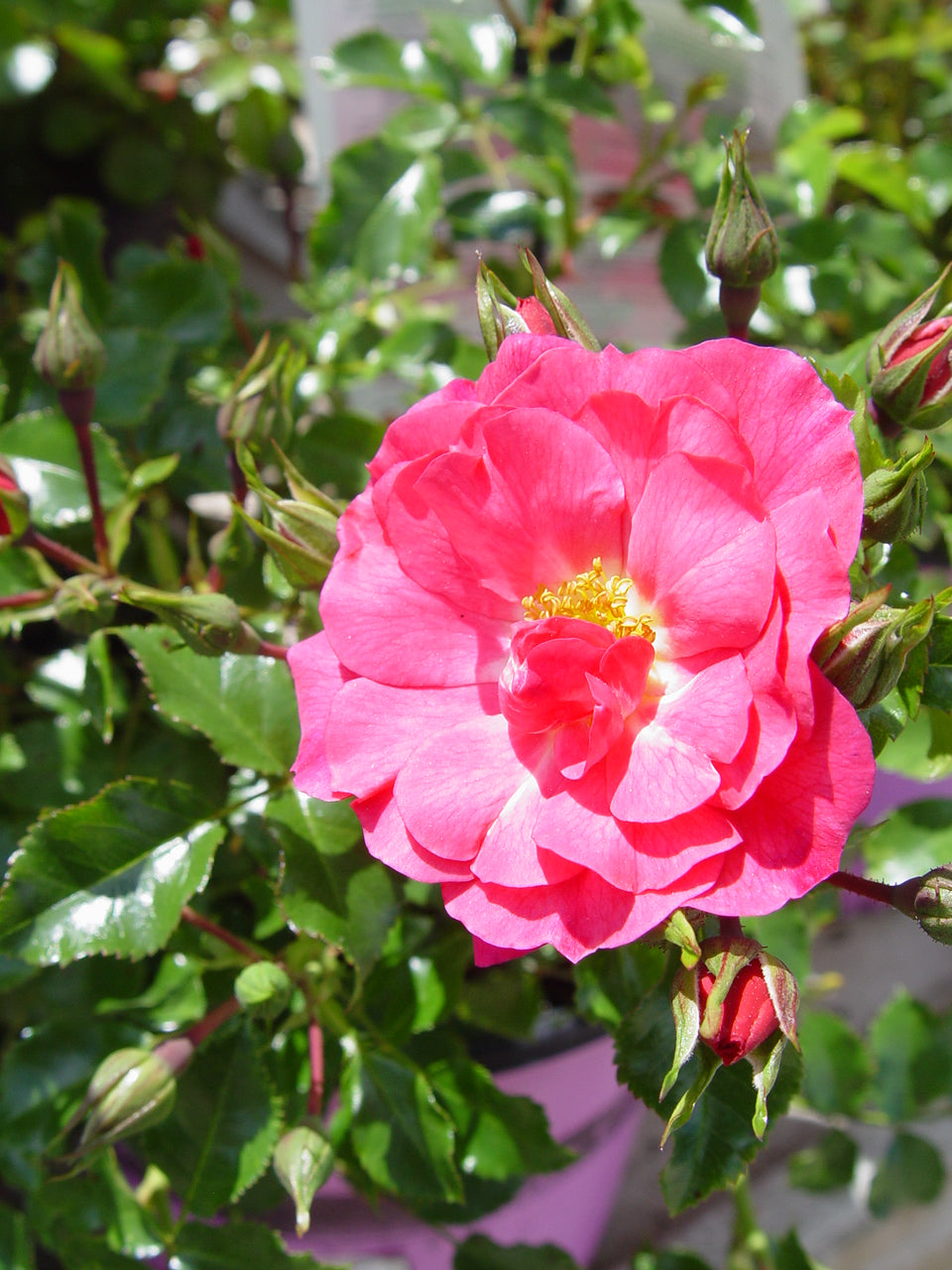 Details: ROSA `FLOWER CARPET`- PINK (Northern Hardy) The old standby that still keeps on performing. Vigorous and spreading, this plant is awash with double, deep pink flowers throughout the growing season and is nearly care free with glossy, disease-resistant foliage. Grow Tips No fancy pruning needed. Cut back by 2/3rds annually in late winter or early spring. Trim to shape anytime of year, if desired. The bush is self-cleaning with few rose hips, no dead-heading required, petals fall away cleanly.