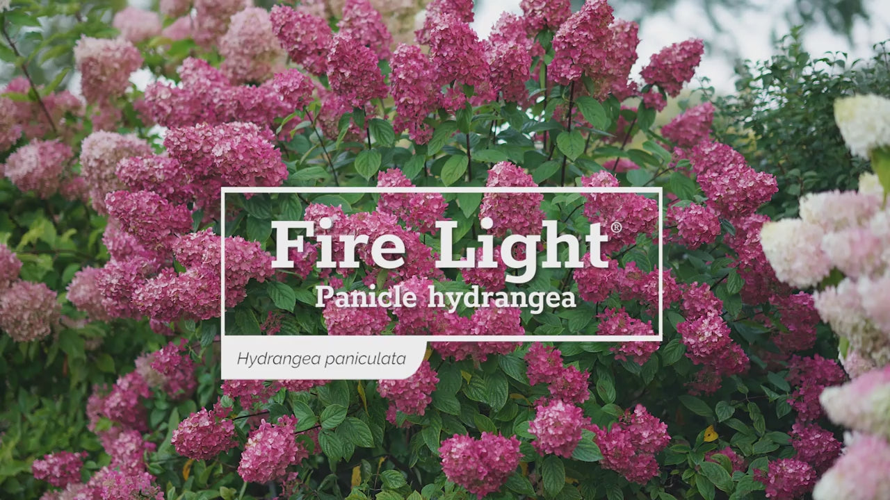 Details: Hydrangea pan. `Fire light` Pp25135 fire light® is the new standard to measure all hardy hydrangeas. Upright panicles are packed with florets which transform from pure white to rich pomegranate-pink. Its thick, sturdy stems hold up the beautiful flowers so they are prominently displayed in the garden throughout the late summer & fall. The Fat, colorful blooms are easy to use as a cut flower or to dry for enjoyment year round. it loves full to half day sun & will add a distinct presence to you landscape when planted alone or grouped to form a colorful border planting.