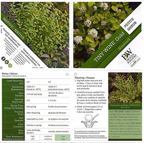 Details: Physocarpus top `tiny wine gold` Pp28, 857 tiny wine® gold offers brilliant yellow new growth, small, refined foliage, & dozens of clusters of white-pink flowers in late spring. A bit smaller than your average ninebark, it's a colorful, easy-care choice for perennial gardens, foundation plantings, & other landscape features. Native to North America. grow tipsall ninebarks are best left unpruned, as they naturally take on a graceful, appealing habit. If you'd like to prune your plant, do so after it flowers. Plant in full sun; ninebarks are drought tolerant once they are established.